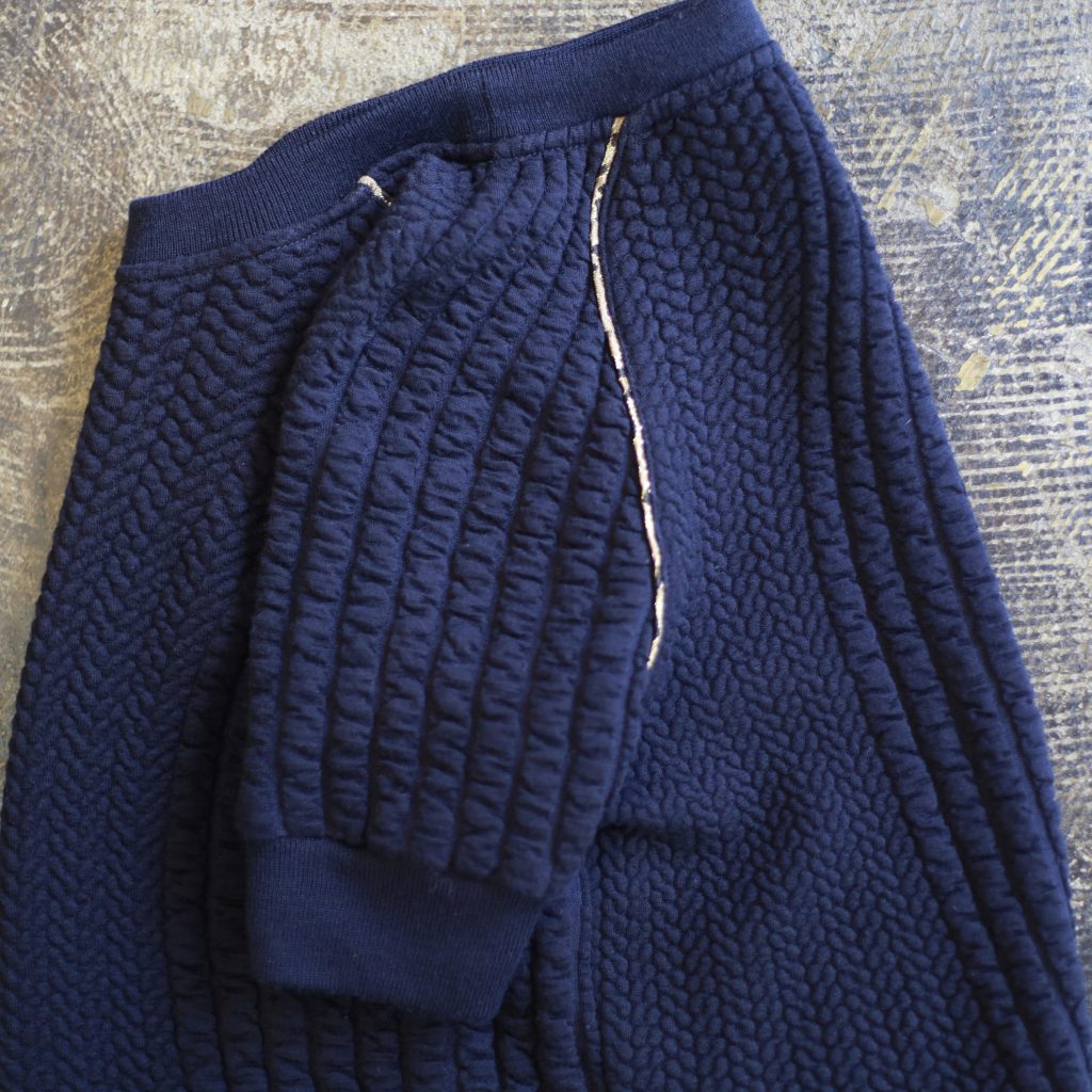 首元、裾に伸縮性の良いリブを使用し、