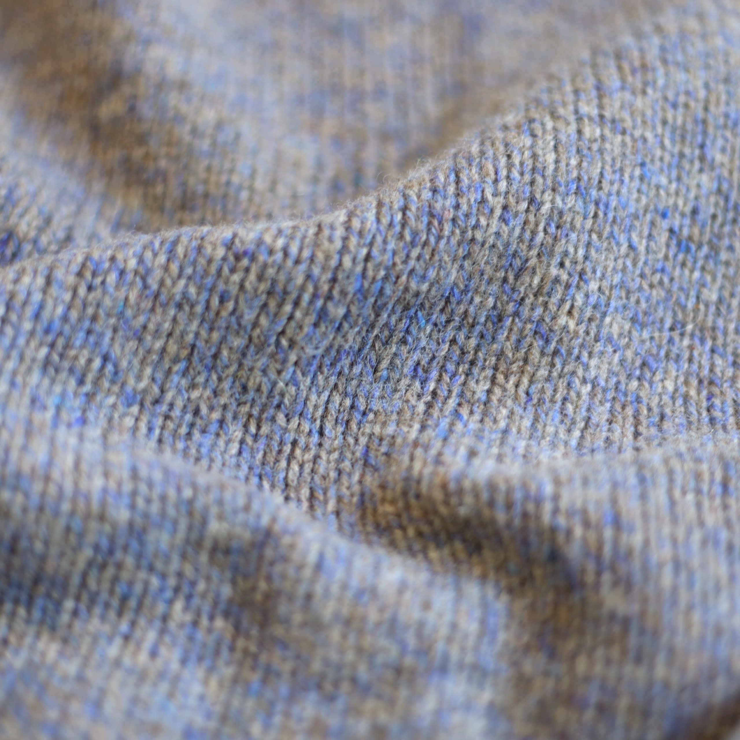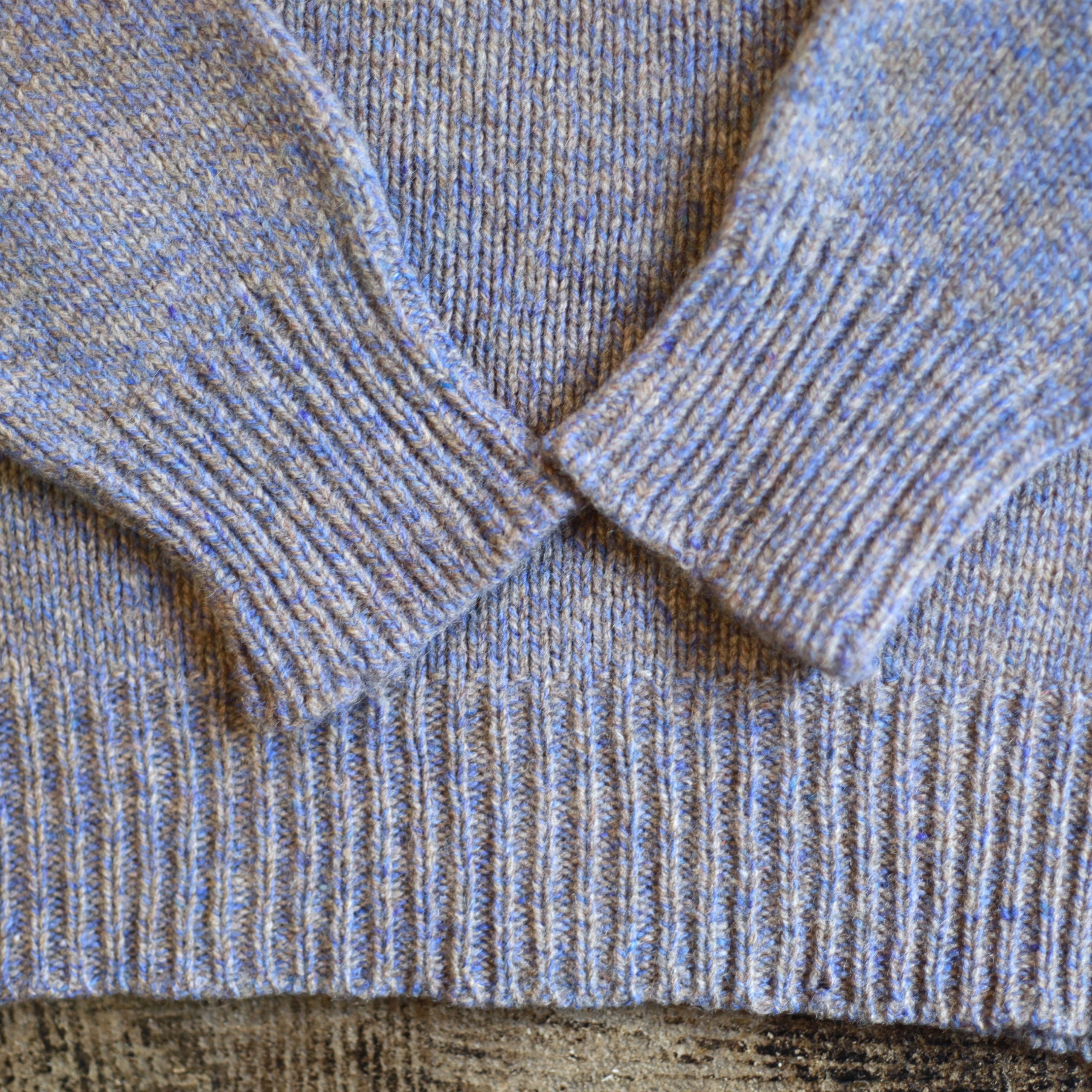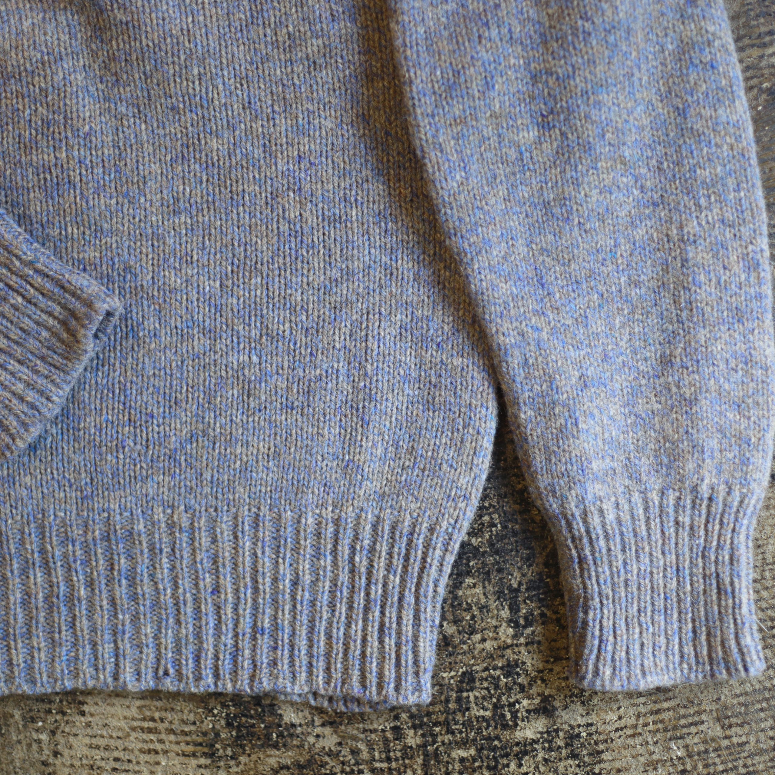 グレージュとブルーの糸で編まれた雰囲気良いミックスニットの色味と